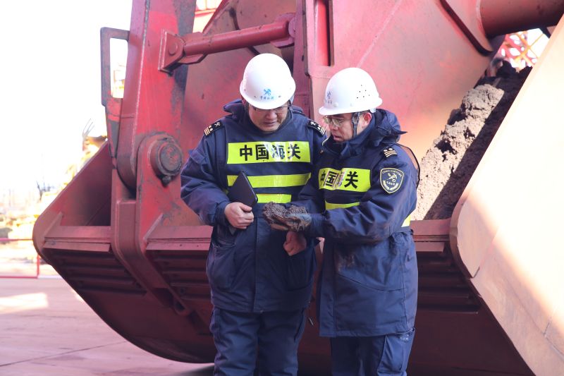 图为:海关关员查验拉美进口铁矿石 石万里/摄