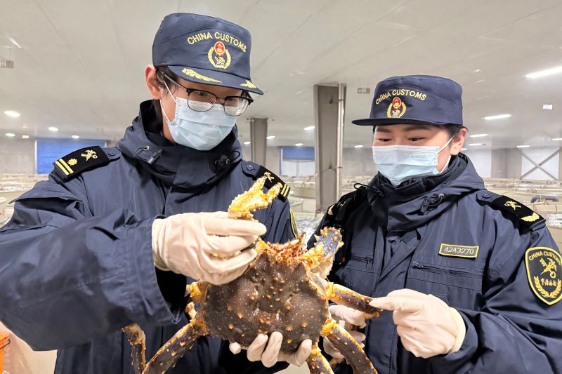 图为:海关关员现场查验进口鲜活帝王蟹 魏绍瑜/摄   近日,一艘装载75吨活帝王蟹的货轮缓缓靠泊山东港口威海港,在青岛海关所属威海海关监管下通关入境,这批漂洋过海的“蟹中之王”将以最快速度端上国人的年夜饭餐桌,为新春佳节增添一道硬核年味。   作为备受国内消费者青睐的高端海鲜,鲜活帝王蟹离水后存活时间短,通关效率直接决定着这份“洋年货”的品质与鲜度。威海海关针对鲜活水产品“时限即生命线”的特性,量身打造了“提前介入+智能联动+快速放行”的监管服务体系,全程护航实现帝王蟹从码头到国内市场的“零等待”。   “在船舶抵港前我们就指导企业通过‘提前申报’方式,事先进行报关和单证审核,船舶到港后第一时间完成口岸检查并放行。”威海海关驻海港办事处查验科科长康新建介绍,进口帝王蟹在码头实现“随卸、随装、随走”,最大限度压缩了供应链时间,让鲜度直达餐桌。   “顺畅的通关流程让我们能够第一时间将鲜活帝王蟹送到国内消费者手中,最大程度锁住鲜味、抢占新春消费市场。”山东润泽冷链物流有限公司董强说。   与此同时,针对企业需求,威海海关还充分释放政策红利,指导企业配套建设暂养池,不仅解决了帝王蟹的仓储问题,也让企业的生产经营模式变得更加灵活。(董尧/文)