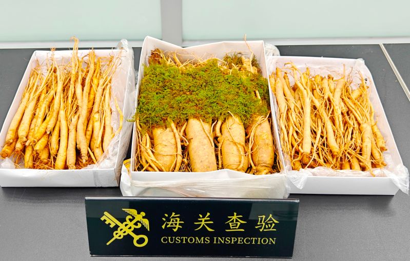 图为:海关关员查获的带土鲜人参 孔令强/摄