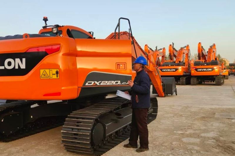 图为:工作人员在对出口东盟的挖掘机进行质量检测 钟杰/摄