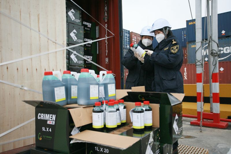 海关关员在对两批申报品名为“百草枯水剂”的出口货物实施现场查验时,发现货物使用纸箱包装,包装UN标记(联合国危险货物包装认证标识)信息与随附的出境危险货物运输包装使用鉴定结果单不符,属于未经使用鉴定的危险货物包装。货物共计918箱、重22.1吨。