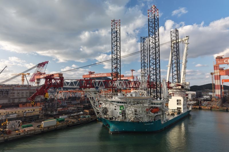 “北欧之风”轮全长146米、宽62米,最大排水量5.6万吨,配备3200吨起重机,能在北欧大风、低温的海况下稳定作业。该船通过采用全直流供电模式,减轻空船重量、提升船舶负载能力的同时,从能源利用源头实现减碳。据测算,该船安装风电设备单兆瓦碳排放可减少70%以上。