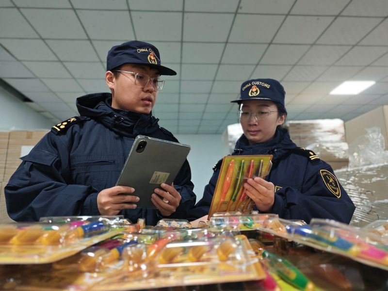 图为:海关关员对进口牙刷进行现场查验 范晨/摄