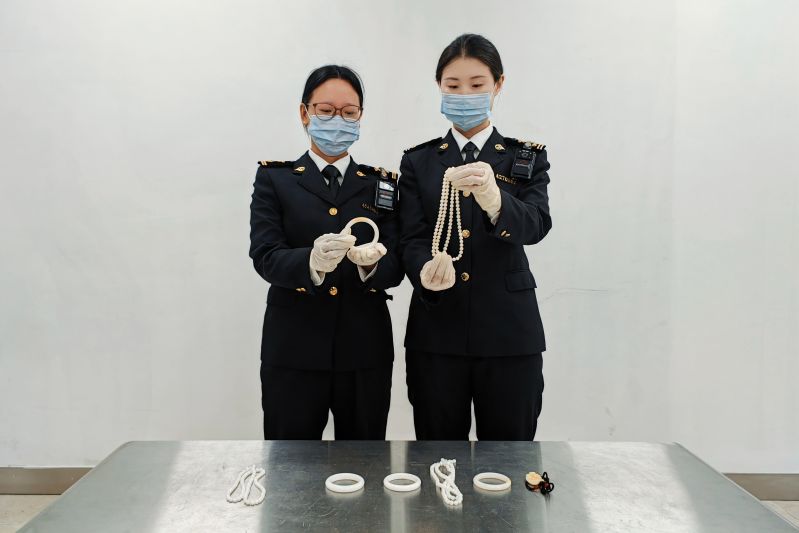 海关关员在对入境航班进行行李物品监管时,发现3名旅客行李CT机图像显示异常。经开箱查验,发现行李中有手镯、项链等疑似砗磲饰品8件,共计574.34g。经鉴定,查获的饰品均为双壳纲帘蛤目砗磲科物种制品。
